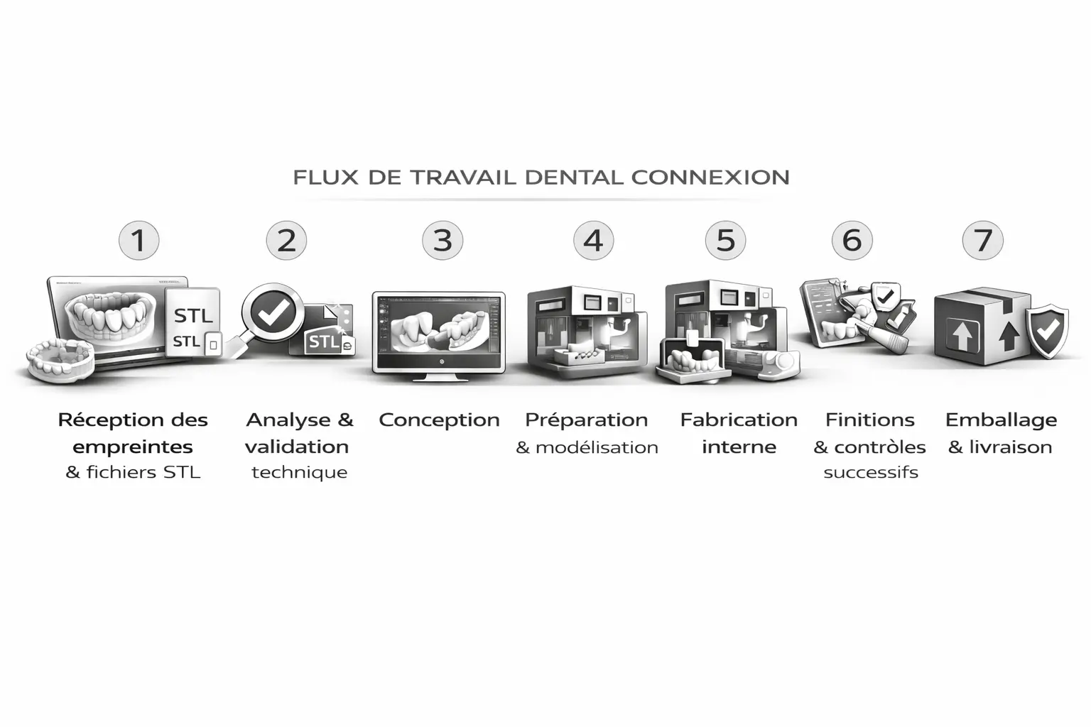 - Vérification de la conformité du dossier : empreintes, fichiers STL, fiches de prescription, photos éventuelles.